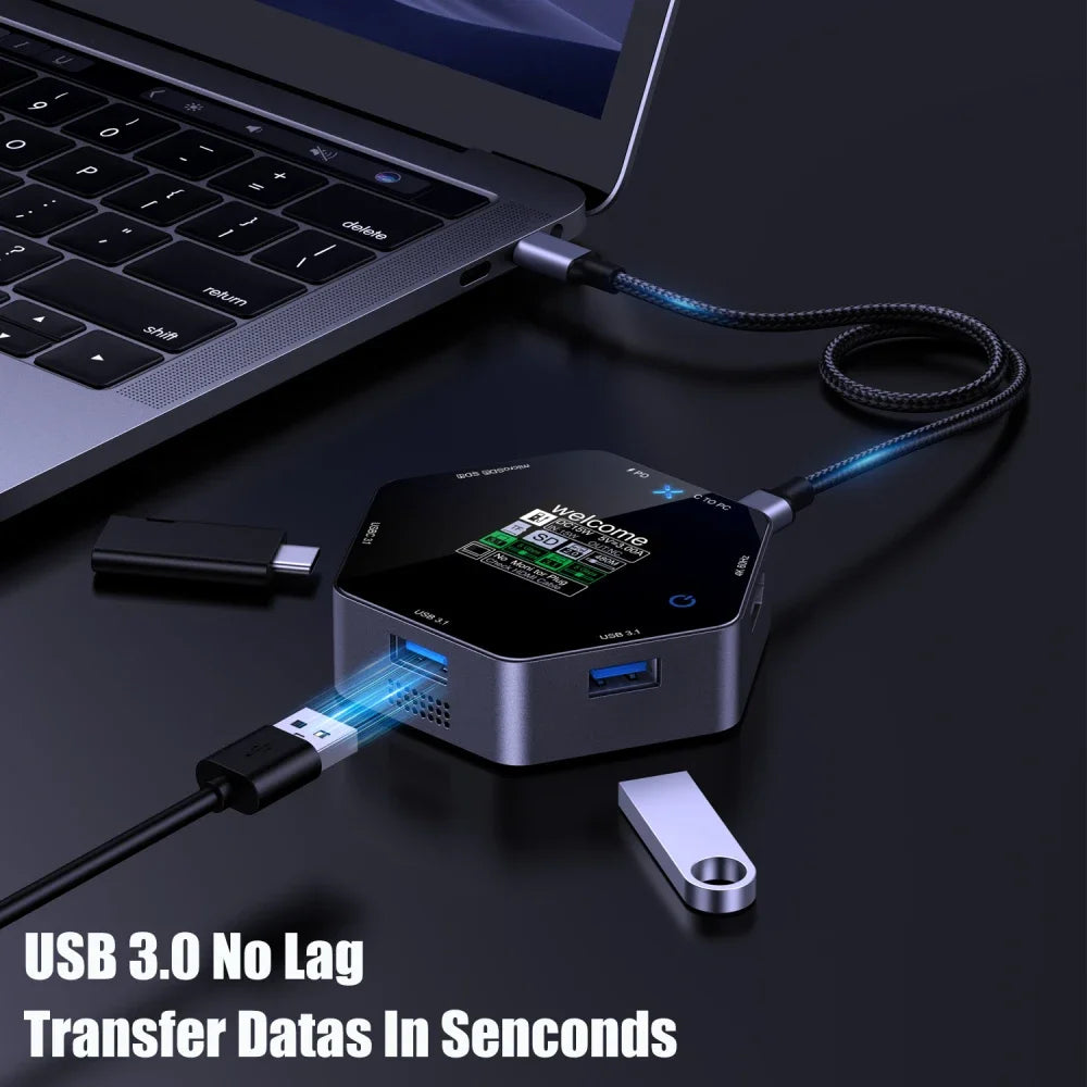 Features USB Type-C 8-in-1 expansion with LCD, real-time capture, and display device parameters. Support 4K 60Hz HD video, PD fast charging 100W, connect mouse, keyboard, U disk, mobile hard disk and SD + TF dual disk drive reader—full standard 3.0 expansion.